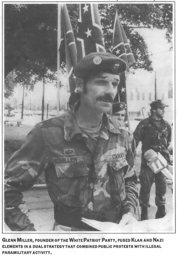 The White Patriot Party had deep roots in North Carolina. A Green Beret who served two tours of duty in Vietnam, Miller was discharged from the Army in 1979 at Fort Bragg, North Carolina for distributing a white supremacist newspaper on base. Over the next decade he worked full-time as a white supremacist organizer, apparently supporting himself in part on his Army retirement pay.