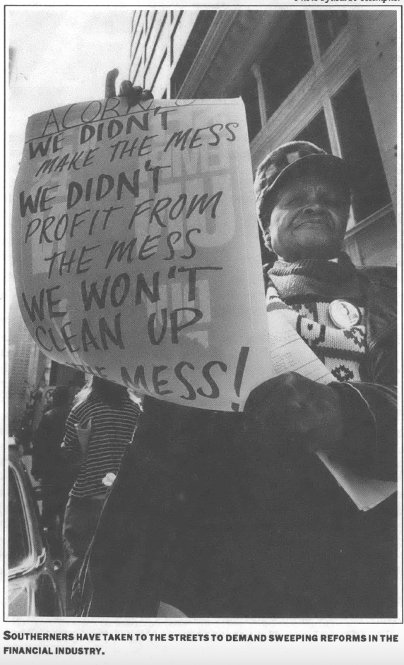 Like every crisis, this one offers us an opportunity to reform the system — a chance to bring a measure of democracy to the world of high finance. Just as the banking crisis of the late 1800s ignited the Southern Populist movement, Southerners today have already taken to the streets over the current financial crisis, placing themselves in the forefront of those demanding sweeping reform. It is the beginning of a new movement — a movement its leaders are calling a campaign for financial democracy.