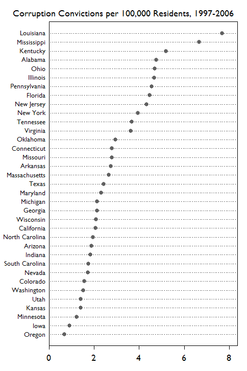 Lee Sigelman and John Sideshave created a graph plotting the "total number of publiccorruption convictions from 1997 to 2006 per 100,000 residents." Here's the graph: