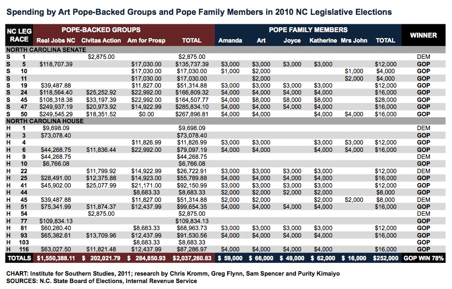 So back to the question: How much money did Pope's network really spend to help win over North Carolina for Republicans in 2010? Below is an updated chart by the Institute for Southern Studies that breaks down the numbers: