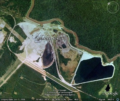 (Google Earth image of the Wateree plant's coal ash impoundments via the Catawba Riverkeeper's website.)
