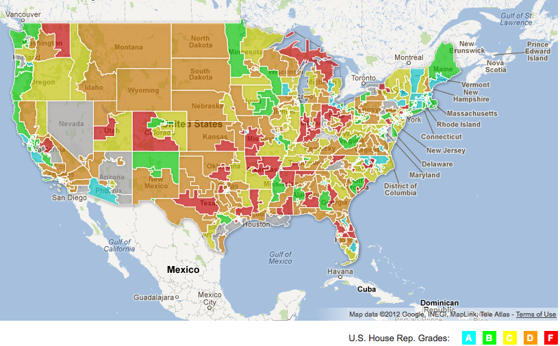 * Republicans also make up the entire list of 48 representatives who got an "F." They include Sandy Adams of Florida, Marsha Blackburn of Tennessee, Kevin Brady of Texas, Mo Brooks of Alabama, Michael Conaway of Texas, Rick Crawford of Arkansas, Renee Elmers of North Carolina, John Fleming of Louisiana, Kay Granger of Texas, Tim Griffin of Arkansas, Sue Myrick of North Carolina, Rich Nugent of Florida, Alan Nunnelee of Mississippi, Pete Olson of Texas, Steven Palazzo of Mississippi, Bill Posey of Florida, Martha Roby of Alabama, Phil Roe of Tennessee, Dennis Ross of Florida, Steve Scalise of Louisiana, Austin Scott of Georgia, Tim Scott of South Carolina and Steve Womack of Arkansas.