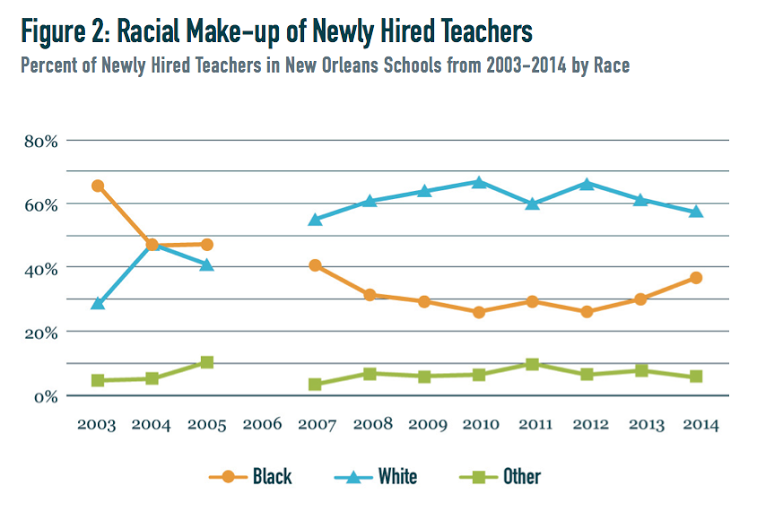 After the firing of all public school teachers and the charter school takeover in post-Katrina New Orleans, schools have hired far more white teachers even as students remain predominantly black. (Chart from "Significant Changes in the New Orleans Teacher Workforce" by the Education Research Alliance.)