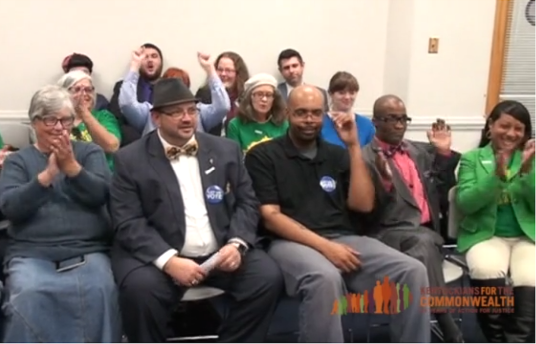Member of Kentuckians for the Commonwealth, a grassroots group that worked to reform the state's harsh felon disenfranchisement policy, celebrate Gov. Steve Beshear's signing of an executive order to restore voting rights to tens of thousands of the state's residents, many of them African-American. (Image is a still from this KFTC video.)
