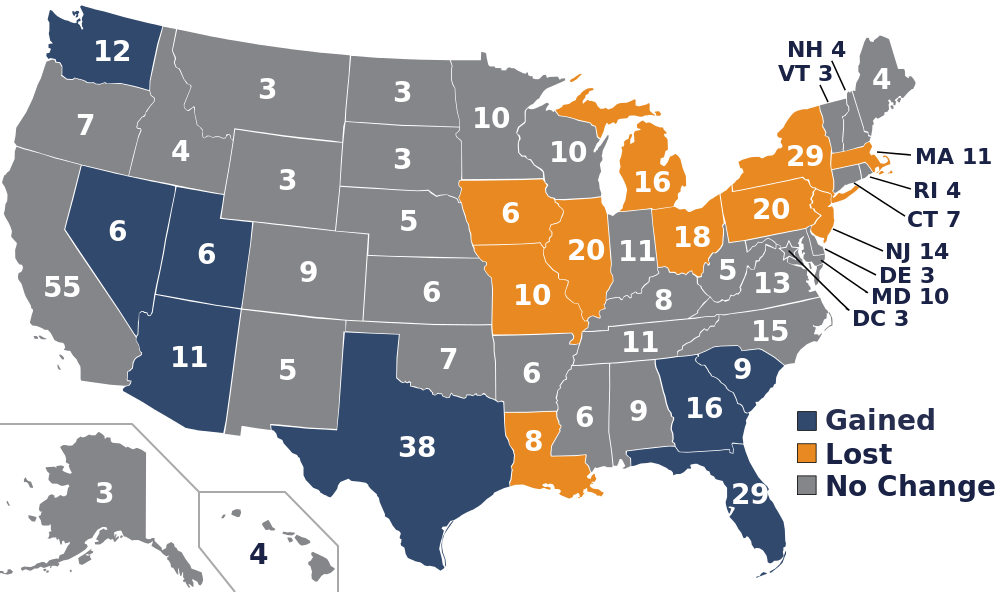 The Electoral College map for the 2012, 2016 and 2020 U.S. presidential elections shows gains made by Southern states following the 2010 Census and reapportionment. The South is expected to gain another five congressional seats and Electoral College votes after the next Census. (Map via Wikipedia.)