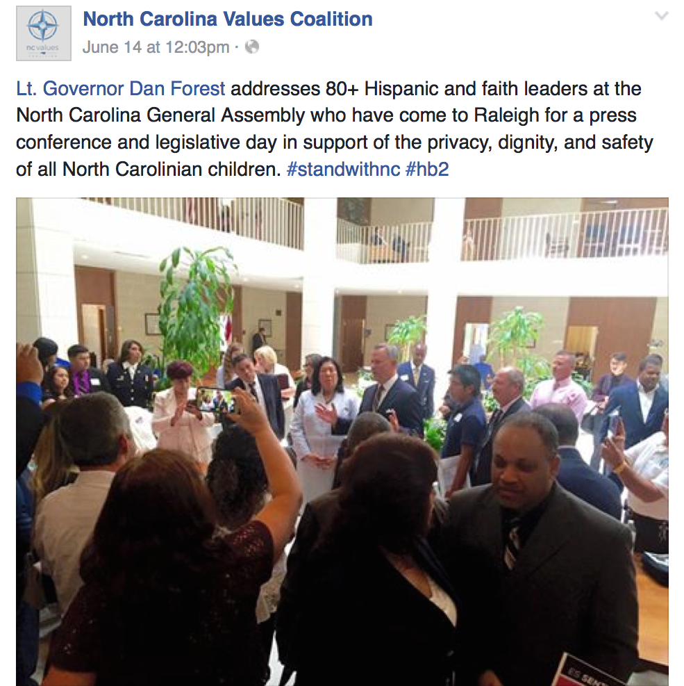 Two days after the massacre at an LGBT nightclub in Florida, the conservative N.C. Values Coalition held a press conference with Latino ministers at the N.C. General Assembly to defend House Bill 2, the controversial new state law restricting which public bathrooms transgender people can use and nullifying local LGBT and other anti-discrimination ordinances. The backlash against LGBT progress represented by HB2 and similar laws is fomenting an atmosphere of anti-LGBT animus. (Image is a post from the N.C. Values Coalition's Facebook page.)