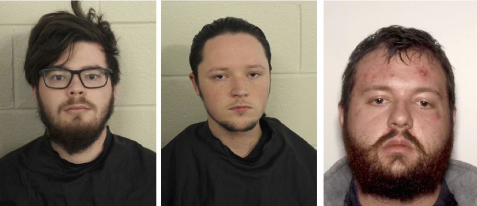 From left to right, Georgia residents Luke Austin Lane of Floyd County, Jacob Kaderli of Dacula, and Michael Helterbrand of Dalton were arrested last year and charged with conspiracy to commit murder and participation in a criminal gang for allegedly plotting the killing of a couple from nearby Bartow County who had been erroneously identified as anti-fascist or "antifa" activists. They are members of a violent hate group known as The Base, which is part of a far-right trend toward the ideology of "accelerationism" that sees the U.S. as in decline and promotes racial violence to hasten its collapse and the creation of a white ethno-state.