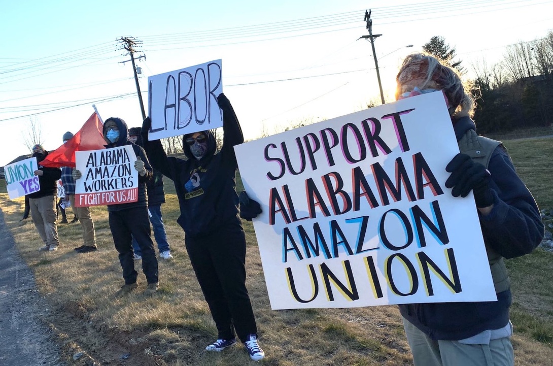 Labor allies like this group in Asheville, North Carolina, rallied across the country last year to support Amazon workers seeking to organize a union at a warehouse in Bessemer, Alabama. The National Labor Relations Board has ordered a new union election after ruling that Amazon used "dangerous and improper" tactics to dissuade workers for voting in favor of the union last April. (Photo courtesy of Support Amazon Workers.)