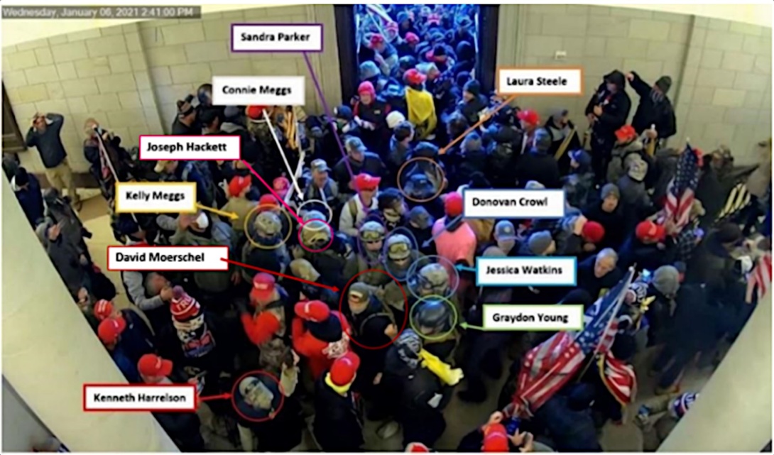 Alleged members and affiliates of the Oath Keepers seen inside the U.S. Capitol during the Jan. 6, 2021, riot in which supporters of former President Trump tried to stop the certification of President Biden's election. Despite the militia group's involvement in seditious violence, the IRS continues to grant some of its chapters nonprofit status, allowing them to avoid paying taxes on the money they raise. (Capitol surveillance footage from a U.S. Department of Justice complaint via Wikimedia Commons.)