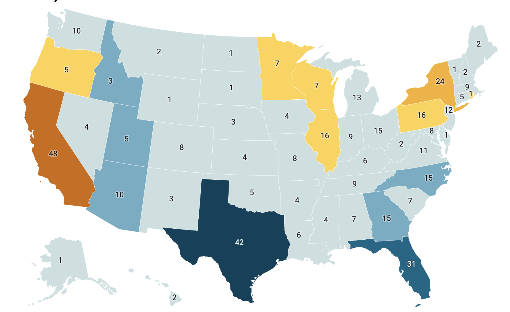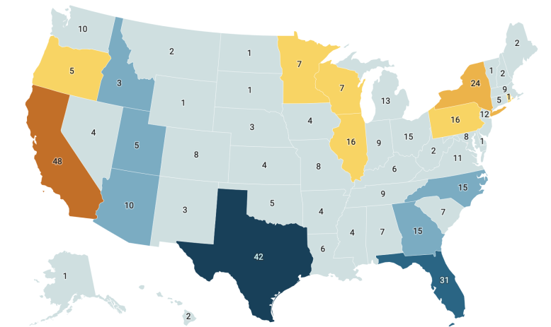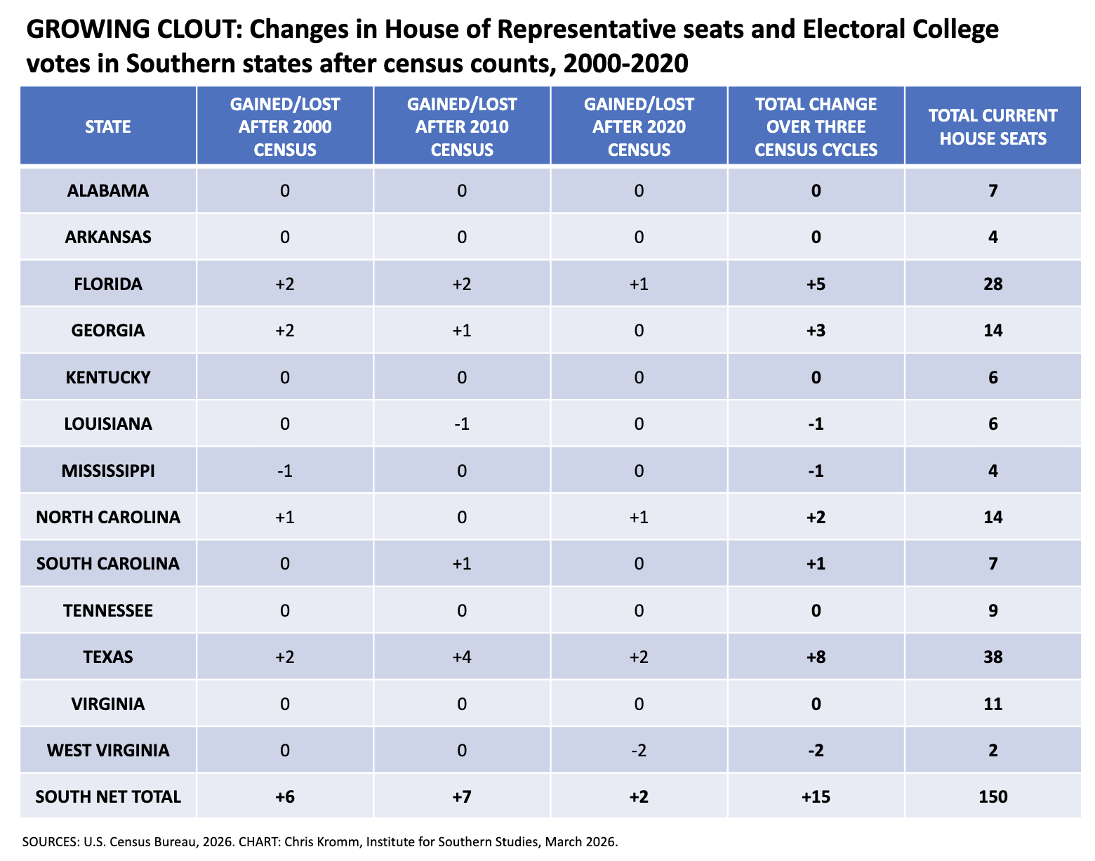 Florida and Texas account for 13 of those added seats, Georgia and North Carolina picked up a combined five seats, and South Carolina added one in that 20-year span. The South’s gains have been mildly tempered by small declines in Louisiana, Mississippi, and West Virginia, which together have lost four seats since 2000.