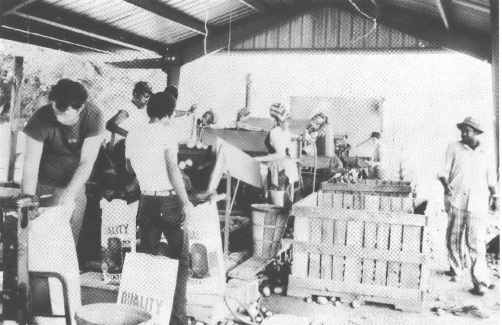 Of course, sudden thunderstorms which delayed harvesting, or wholesalers ordering 500 bags of Irish potatoes due the first thing the next morning were not geared into NCI's new labor policy. When it came quitting time, and only 300 bags of potatoes had been sorted and filled, what were the workers supposed to do? Management at first prevailed upon them to stay until the order was filled — until 10 p.m. on some nights. But several days of this were enough, and most workers, at first reluctantly, then easily, drifted away at quitting time, no matter what still needed to be done. The volunteers, just as sweaty and tired from a long day in the fields, also drifted away. Orders were delayed, potatoes rotted in the field as well as in bags left too long in the shed.